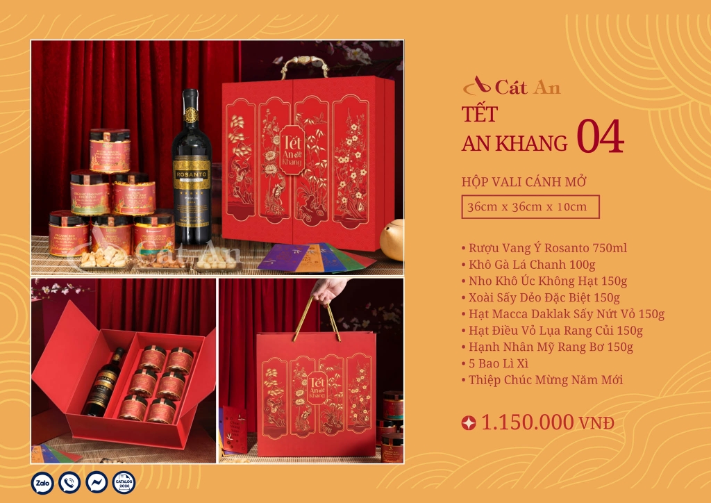 Hộp quà Tết An Khang sở hữu thiết kế vali đỏ trầm sang trọng, biểu trưng cho may mắn và sự đủ đầy trong năm mới. Bề mặt hộp nổi bật với bốn ô họa tiết tùng – cúc – trúc – mai in vàng kim tinh xảo, mang ý nghĩa cát vượng và phúc khí. Ở trung tâm, nhãn “Tết An Khang” được tạo hình trang nhã, cân đối tổng thể.