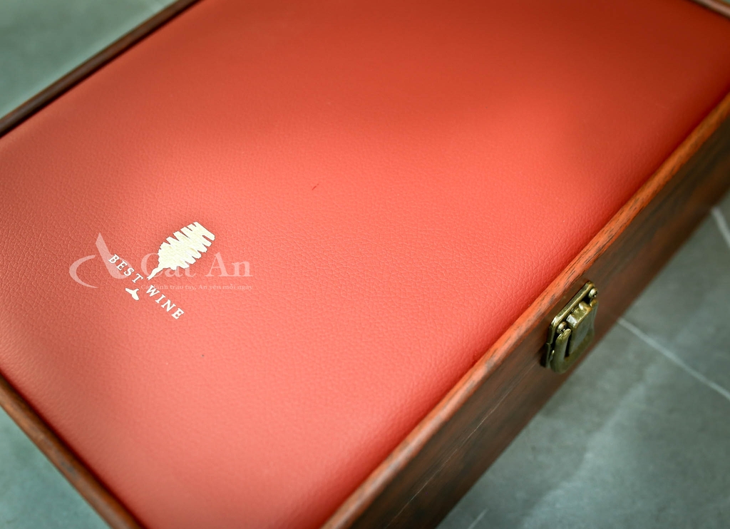 Hộp quà Tết Như Ý sở hữu thiết kế sang trọng với vỏ gỗ kết hợp nắp da PU đỏ trầm – sắc màu biểu trưng cho may mắn và thịnh vượng đầu năm. Bề mặt da mịn được điểm logo ánh bạc tinh tế, trong khi viền gỗ phủ bóng cùng khóa và tay cầm kim loại ánh vàng tạo nên tổng thể đẳng cấp, hiện đại và chuẩn quà biếu doanh nghiệp. Biểu tượng trên nắp hộp là hình cây thông cách điệu được thiết kế tối giản bằng các nét xếp tầng, mang ý nghĩa chúc năm mới an lành, vững vàng và phát tài.