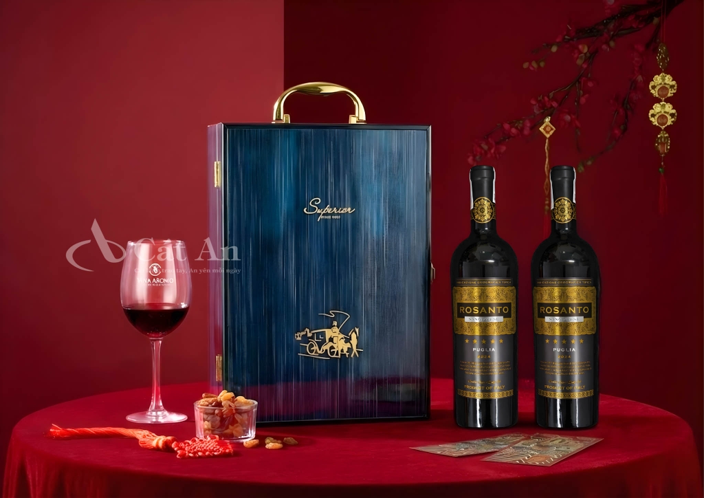 Tay cầm kim loại ánh vàng cùng khóa hộp đồng bộ được chế tác tinh xảo, mang đến vẻ đẹp đẳng cấp và đầy quý phái. Với kích thước 35 × 25 × 10cm, đây là lựa chọn lý tưởng cho những món quà biếu Tết trang trọng và tinh tế.