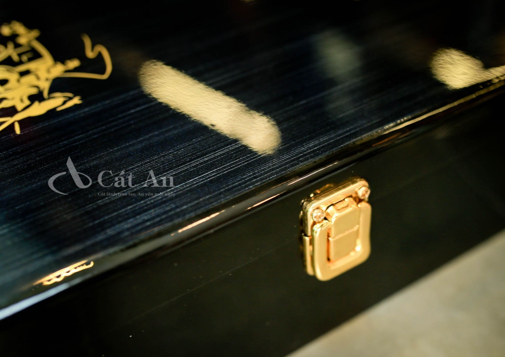 Tay cầm kim loại ánh vàng cùng khóa hộp đồng bộ được chế tác tinh xảo, mang đến vẻ đẹp đẳng cấp và đầy quý phái. Với kích thước 35 × 25 × 10cm, đây là lựa chọn lý tưởng cho những món quà biếu Tết trang trọng và tinh tế.
